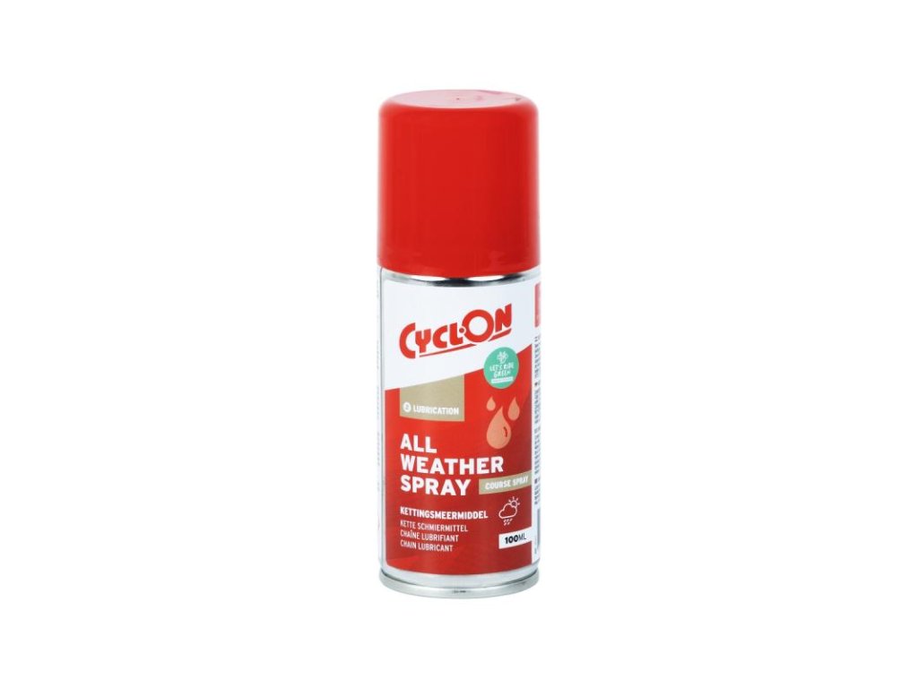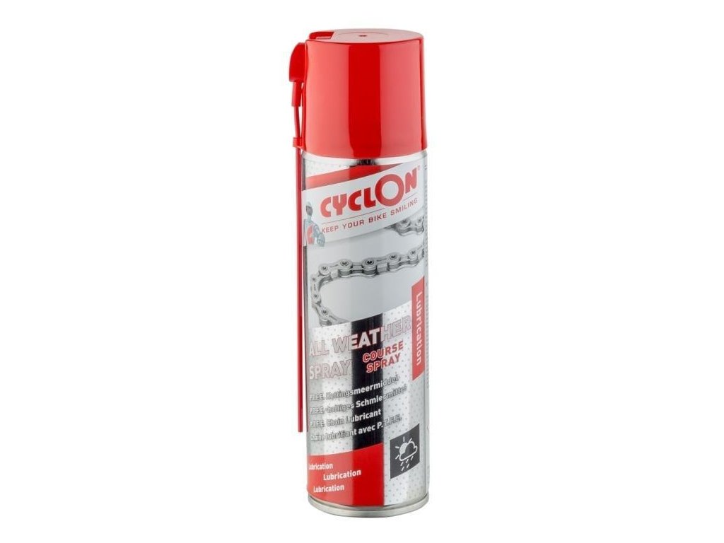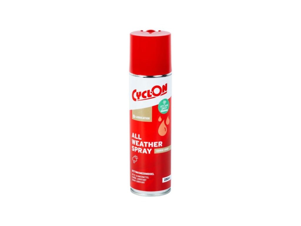 CyclOn All Weather Spray je biologicky odbúrateľný mazací sprej vhodný do všetkých poveternostných podmienok. Tento olejový lubrikant obsahuje revolučné mikro aditíva na molekulárnej úrovni. Mikro aditíva prenikajú do najmenších nerovností povrchu materiálov, čím zaisťujú dlhšie mazanie, menšie opotrebovanie a vyššiu odolnosť proti treniu. Mikro aditíva na molekulárnej úrovni zaisťujú hladký chod reťaze a mazaných komponentov a povrchovou priľnavosťou, vytvárajú antiadhéznu a vodu odpudzujúcu vrstvu, ktorá znižuje trecí odpor. Vďaka ním sú stopy opotrebenia vyplnené, čo predlžuje životnosť mazaných komponentov. Vhodné na použitie v silnom mraze i horúcom slnečnom počasí.CyclOn All Weather Spray odoláva extrémnemu tlaku a nie je vytlačaný z článkov počas silného až extrémneho pedalovania. Vďaka tomu je mazivo veľmi vhodné aj pre e-bicykle! Navyše tento sprej ľahko preniká do všetkých špár a priestorov, vďaka čomu je vhodný aj na mazanie laniek a bovdenov, či iných komponentov.