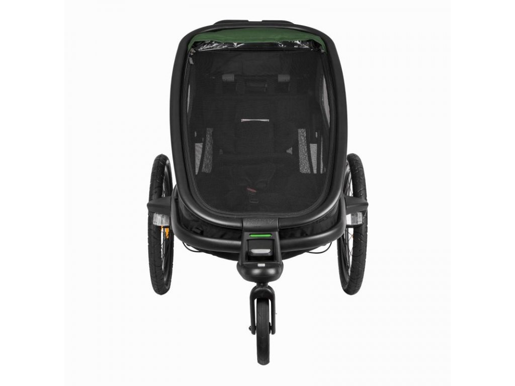 Pevný hliníkový rám poskytuje optimálnu ochranu dieťaťa a veľkorysý priestor v kokpite. Predná časť vozíka je vybavená unikátnym „Safe Connection Point“, ktorý zaisťuje bezpečné prepínanie medzi ramenom na bicykel, kolesom kočíka, kolesom na behanie a ťažným zariadením na lyže.